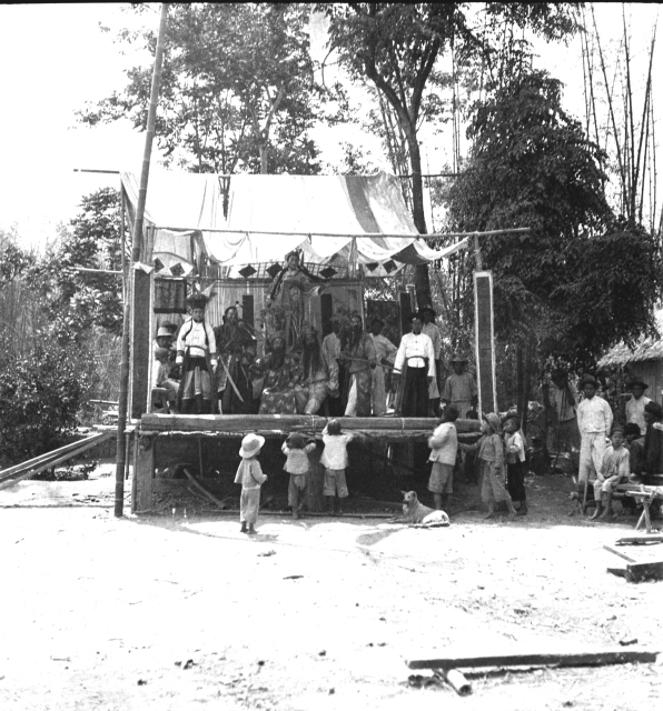 傣戲。過去,德宏傣區不少村寨都有業餘戲隊,春節期間,在本村或到他村演出,增添節日氣氛,活躍農村文化生活。戲的內容有少數民族的,有漢族的,這齣戲從著裝上看是漢族的,男的著漢裝,女的著傣裝。其實,穿女裝的並不是女人,而是男扮女裝。舊時,男女地位不平等,女的不興上臺演戲。20世紀90年代,盈江業餘戲隊卻出現了女扮男裝的現象。傣戲,是演給人看,不是演給神看,娛人不娛神,因此戲臺一般搭在村中或「擺」場上,不興搭在莊房或廟裏唱戲。請的形式,通常是以去拜佛的班輩為單位請的,費用用大家苦來的錢支付。目前,傣戲仍然有一定市場,老年人喜歡看古裝戲,年輕人喜歡看小品。業餘戲隊,盈江較盛行,其他縣市已不多。(龔艾保) |